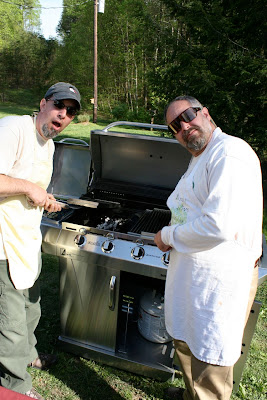 Last spring at the traditional final night cookout for the New River Birding Festival, Geoff and his right-hand man Keith Richardson were manning the brand new, huge and shiny gas grill. They hooked up the gas and fired that baby up, turning to prep the meat for its fiery demise.